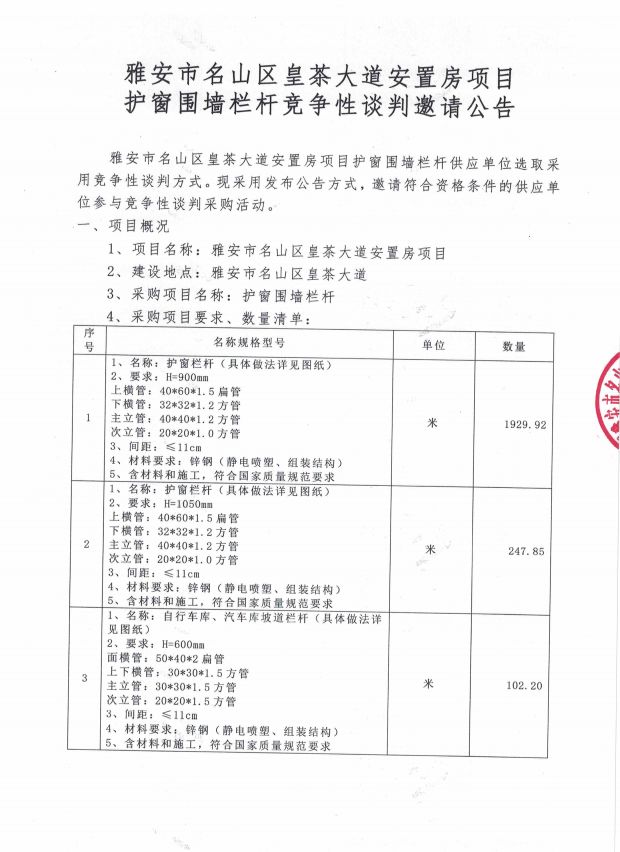雅安市名山區(qū)皇茶大道安置房項(xiàng)目 護(hù)窗圍墻欄桿競爭性談判邀請(qǐng)公告